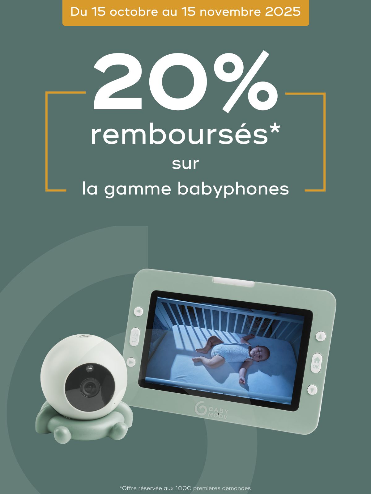 Offre de remboursement différé par virement bancaire de 20% du prix d'achat d'un produit de la sélection babyphones. Virement sous 6 à 8 semaines. Offre valable pour un achat réalisé entre le 15/10/2025 et le 15/11/2025 inclus, limitée à 1 remboursement par foyer (même nom, prénom et/ou adresse postale et/ou e-mail et/ou compte bancaire), par ticket de caisse et réservée aux 1000 premières demandes. Les demandes incomplètes seront considérées comme nulles. Participation jusqu'au 30/11/2025.