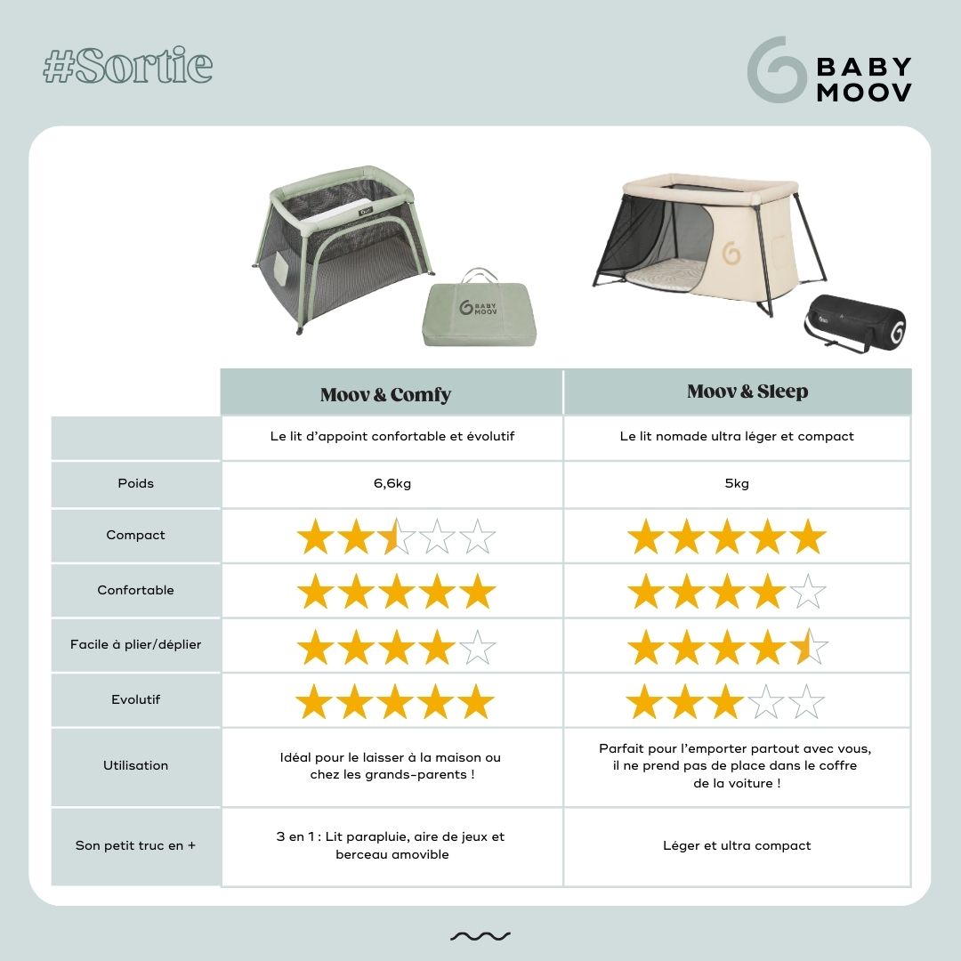 Le lit parapluie Babymoov 3-en-1 Moov and Comfy est un lit ultra léger, qui se plie et se déplie en quelques secondes seulement. Un lit pratique, confortable et ultra stable dès la naissance de bébé et jusqu'à ses 4 ans.