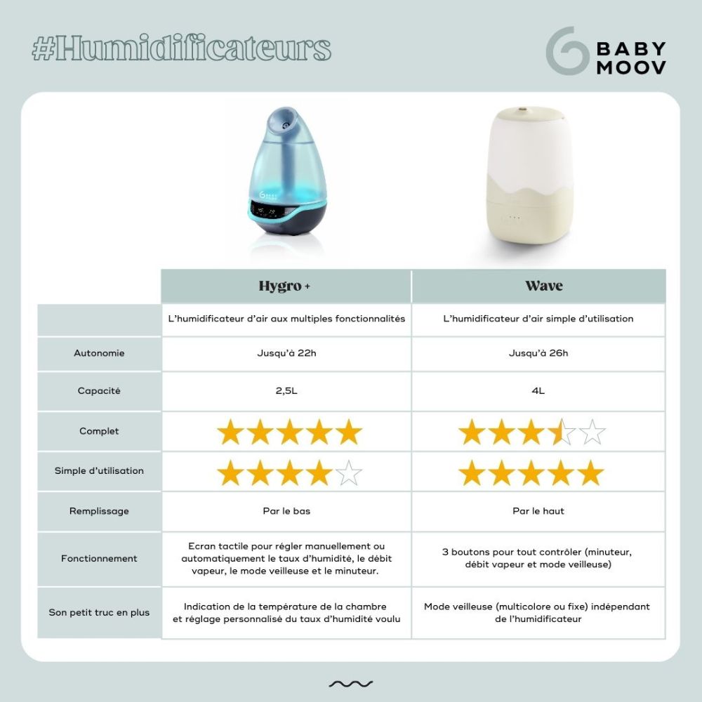 Si vous cherchez une grande autonomie, nous vous orientons vers l'humidificateur bébé Hygro(+) qui propose jusqu'à 22h d'autonomie pour une pièce de 20m2 avec arrêt automatique. Tout comme l'humificateur bébé Hygro, l'Hygro(+), est également silencieux pour ne pas perturber le sommeil de votre enfant. Nos humidificateurs bébé ont un hygromètre intégré pour vous aider à surveiller précisément le taux d'humidité de la chambre.
